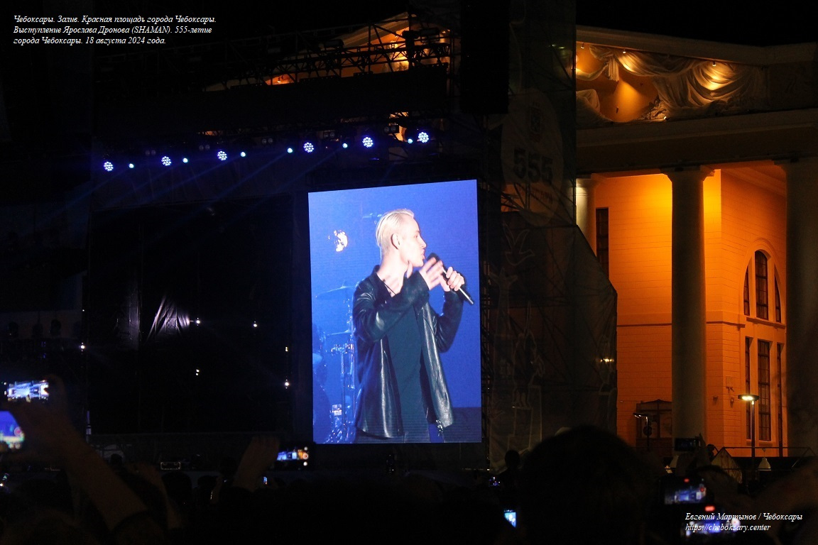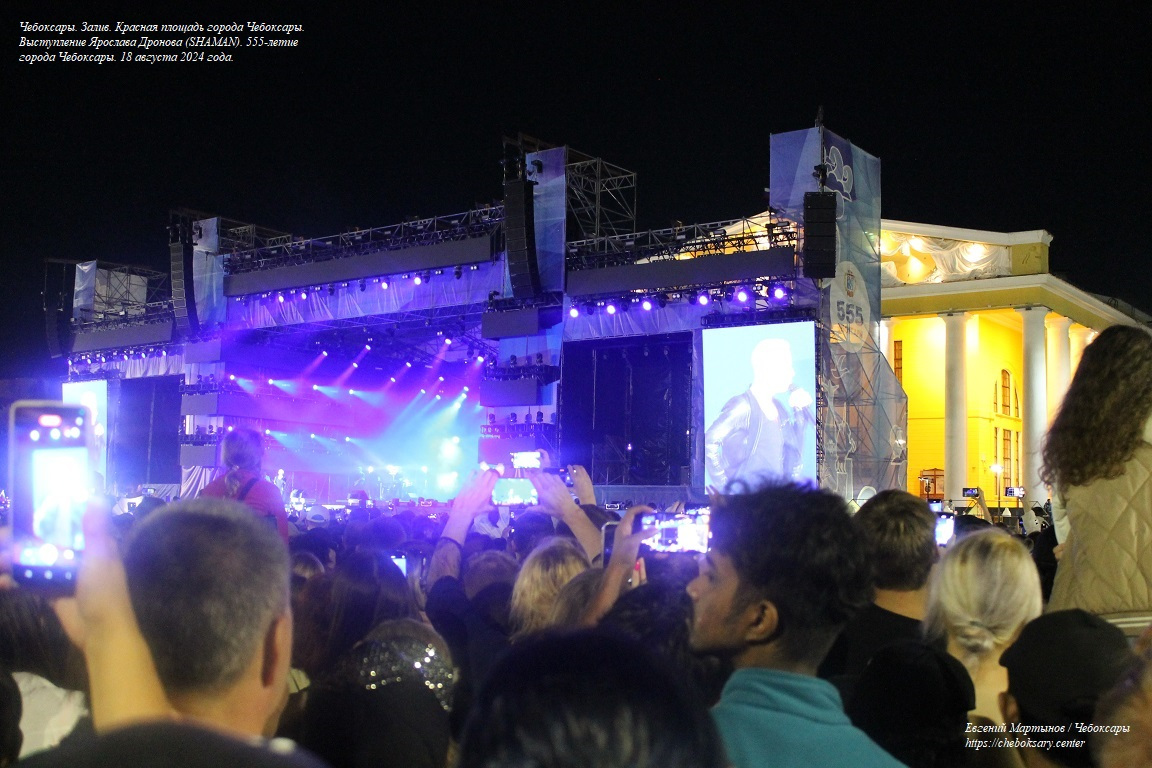 Также нижняя фотография. Кульминацией праздничного дня стало выступление на Красной площади города Чебоксары (район Чебоксарского залива) российского певца Ярослава Дронова (SHAMAN), исполнившего свои главные хиты - “Дай жару!”, “Встанем”, “Я русский”. Концерт с исполнением патриотических песен был горячо поддержан собравшимися жителями и гостями города, плотно заполонившими собою практически всю Красную площадь Чебоксар.