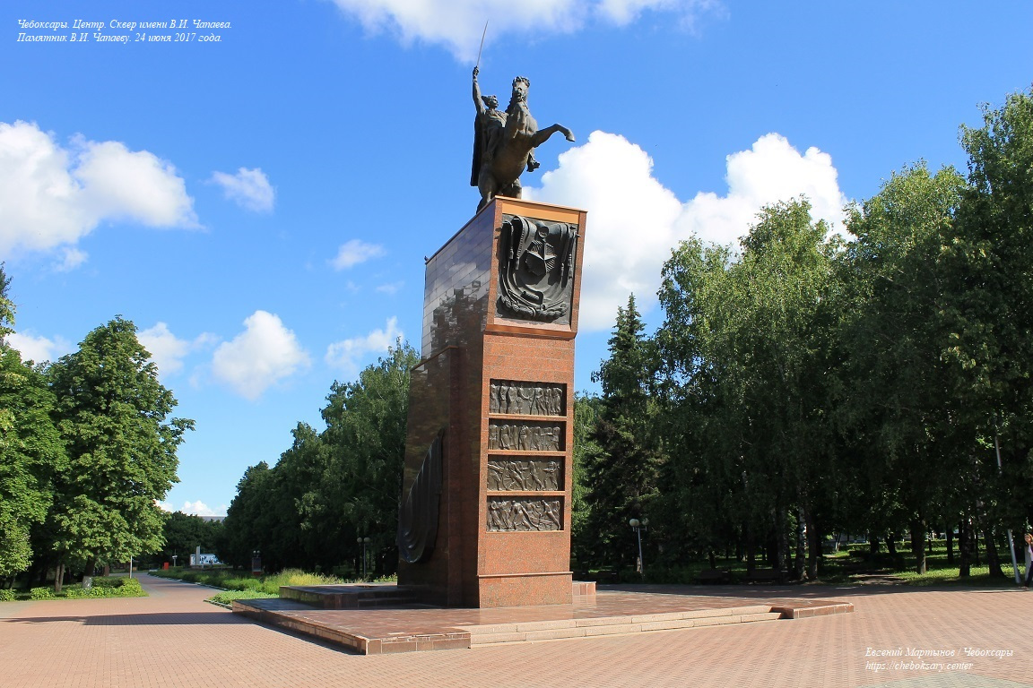 Также две нижние фотографии. Центральной экспозицией сквера является памятник Василию Ивановичу Чапаеву. Первоначально монумент украшал Приволжский павильон в ВДНХ (г. Москва), затем перемещён в Чебоксары. Памятник был открыт в июне 1960 года, и является объектом культурного наследия федерального значения. На верхнем фотоснимке - общий вид на памятник. На среднем фотоснимке - информационная надпись на постаменте. Информация на табличке продублирована и на чувашском языке. На третьем фотоснимке - скульптура Василия Ивановича Чапаева на коне и с саблей крупным планом.