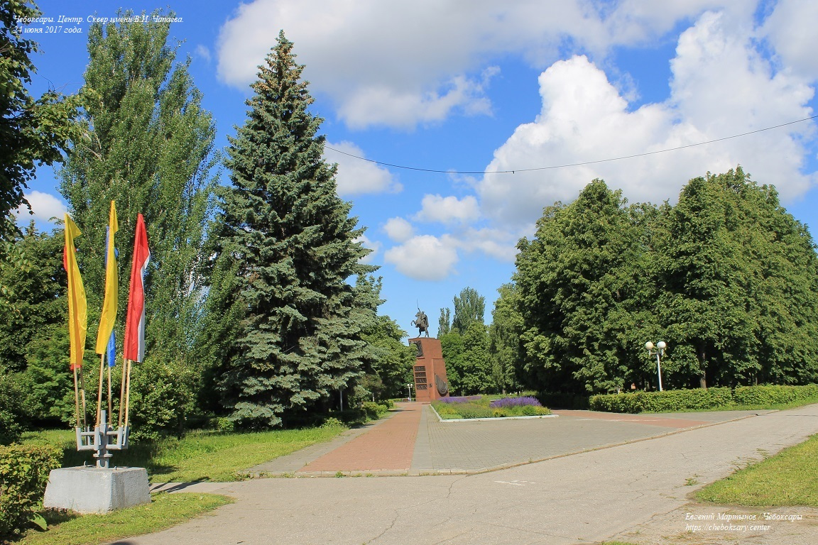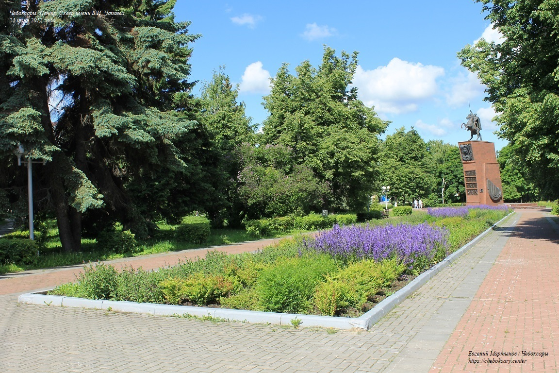 Также все нижние фотографии. Сквер имени В.И. Чапаева (в городском просторечии - “Сквер Чапаева”) - пожалуй, самый известный чебоксарский сквер. Расположен в центральной части города, неподалеку от Чебоксарского железнодорожного вокзала, и идет параллельно проспекту Ленина. Сквер хорошо зарекомендовал себя как место для “спокойного” отдыха чебоксарцев - в дневное время здесь можно заметить немало прогуливающихся молодых парочек, уже состоявшихся семейных пар и людей старшего возраста; вечером скамейки “оккупируют” группы молодёжи. Все фотографии сделаны 24 июня 2017 года.