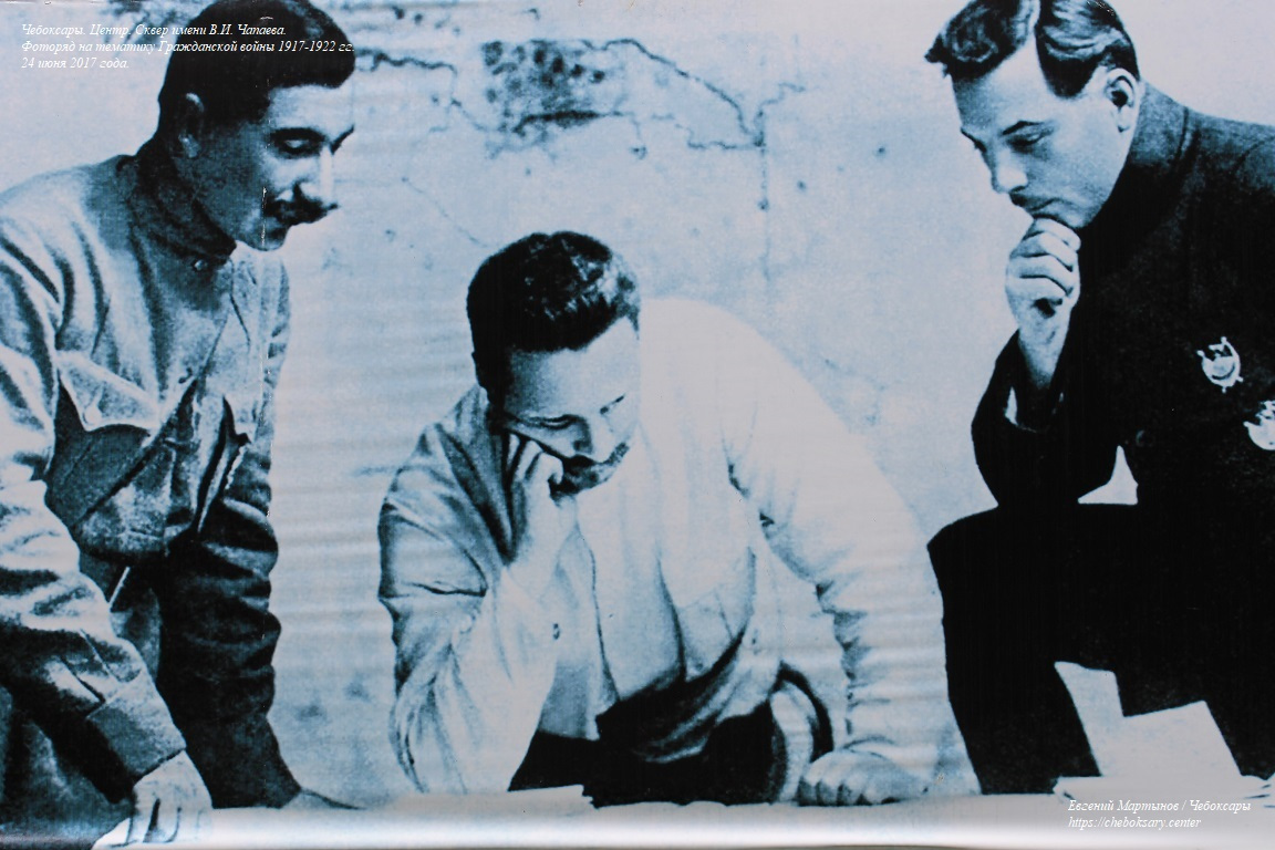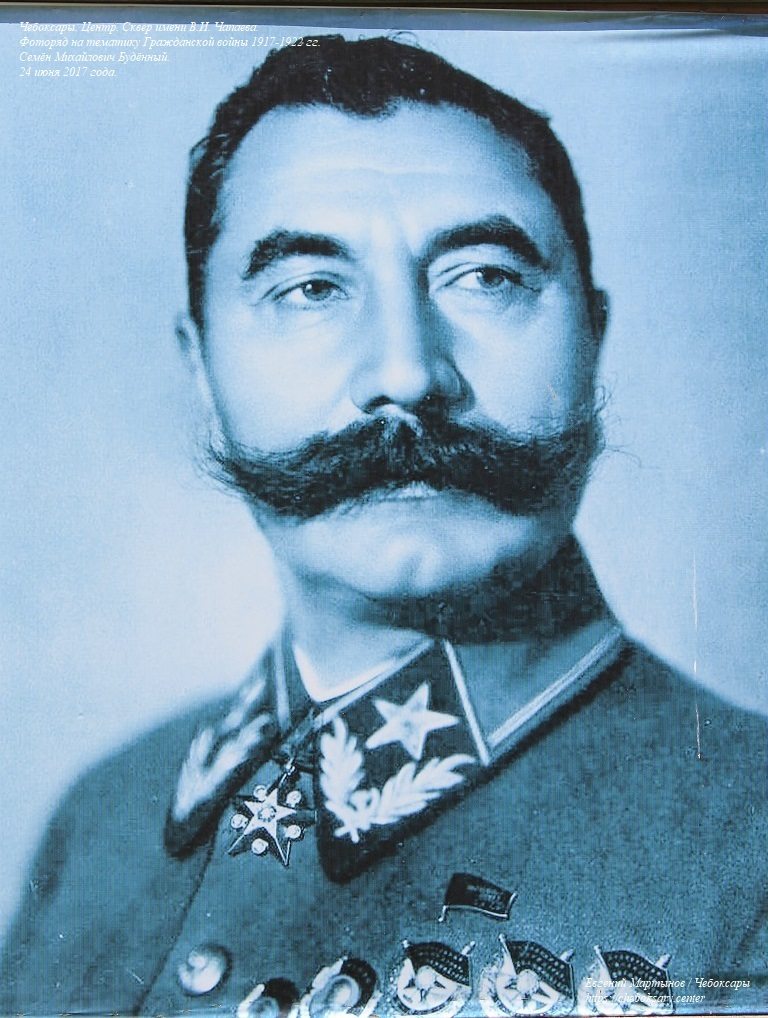 Также нижняя фотография. Фоторяд на тематику Гражданской войны 1917-1922 гг., расположенный вблизи музея В.И. Чапаева (на нижнем фотоснимке - маршал Советского союза Семён Михайлович Будённый).