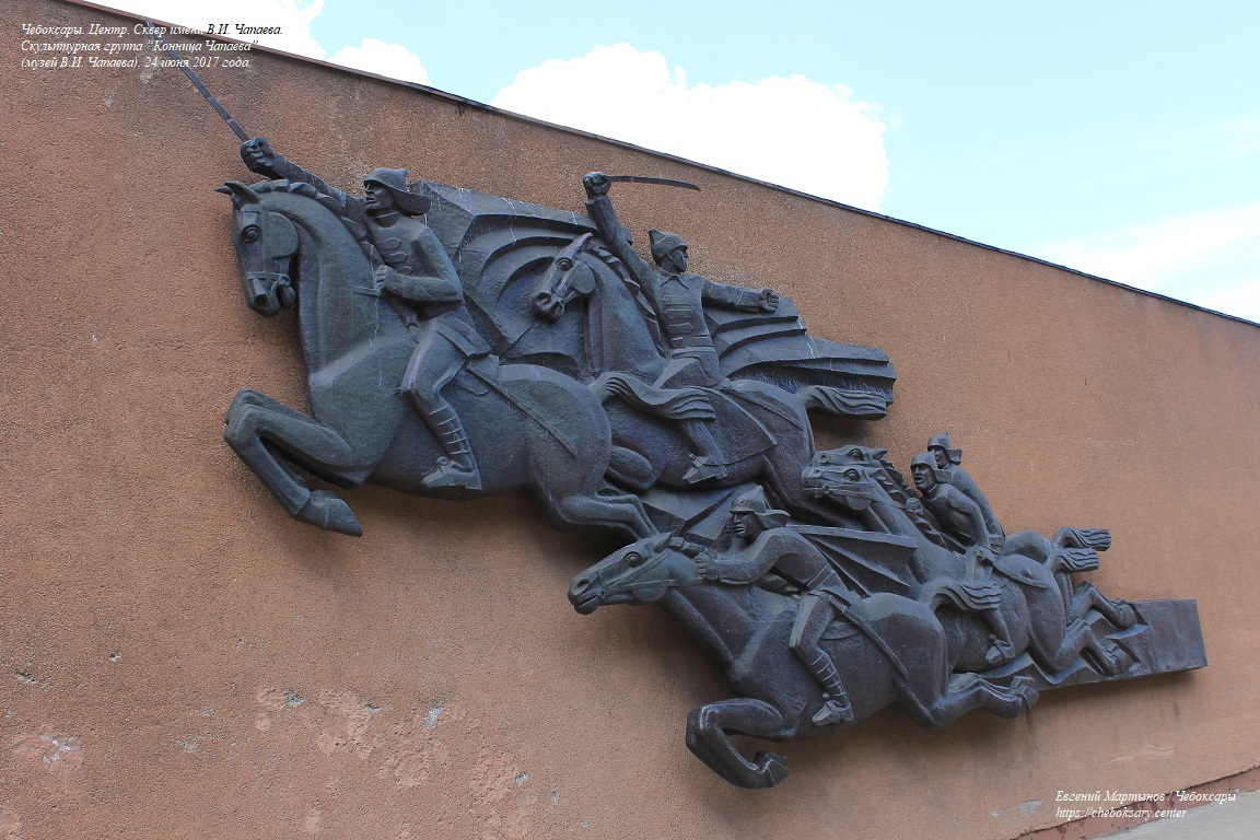 Также нижняя фотография. Помимо памятника, в центральной части сквера расположен и музей, посвящённый Василию Чапаеву (“Музей В.И. Чапаева”; верхний фотоснимок). Музей был открыт 9 мая 1974 года (официальный адрес - проспект Ленина, 46 А). На стене музея представлена скульптурная группа “Конница Чапаева”, выполненная из меди в форме горельефа (нижний фотоснимок).