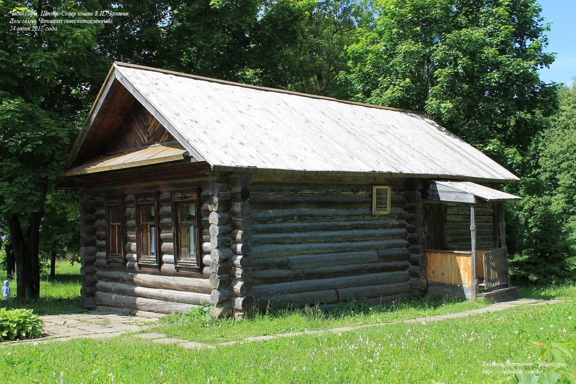 Восстановленный дом семьи Чапаевых. Изначально дом был расположен в деревне Будайка, являвшейся на тот момент времени пригородом Чебоксар (сейчас о некогда существовавшей деревне напоминает лишь одноимённая остановка общественного транспорта, расположенная на улице Гагарина, и мемориальный камень на месте, где стоял дом Чапаева). Затем дом был перевезён в другую деревню, и уже оттуда - в сквер, где и находится по сегодняшний день. В этом доме воссоздан внутренний вид русской крестьянской избы конца XIX столетия и размещены подлинные предметы утвари и быта, непосредственно принадлежавшие родственникам Василия Ивановича Чапаева.
