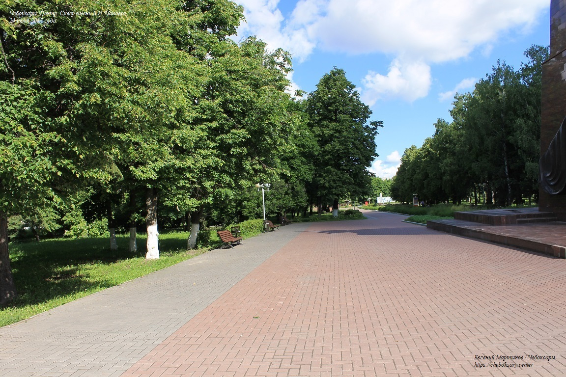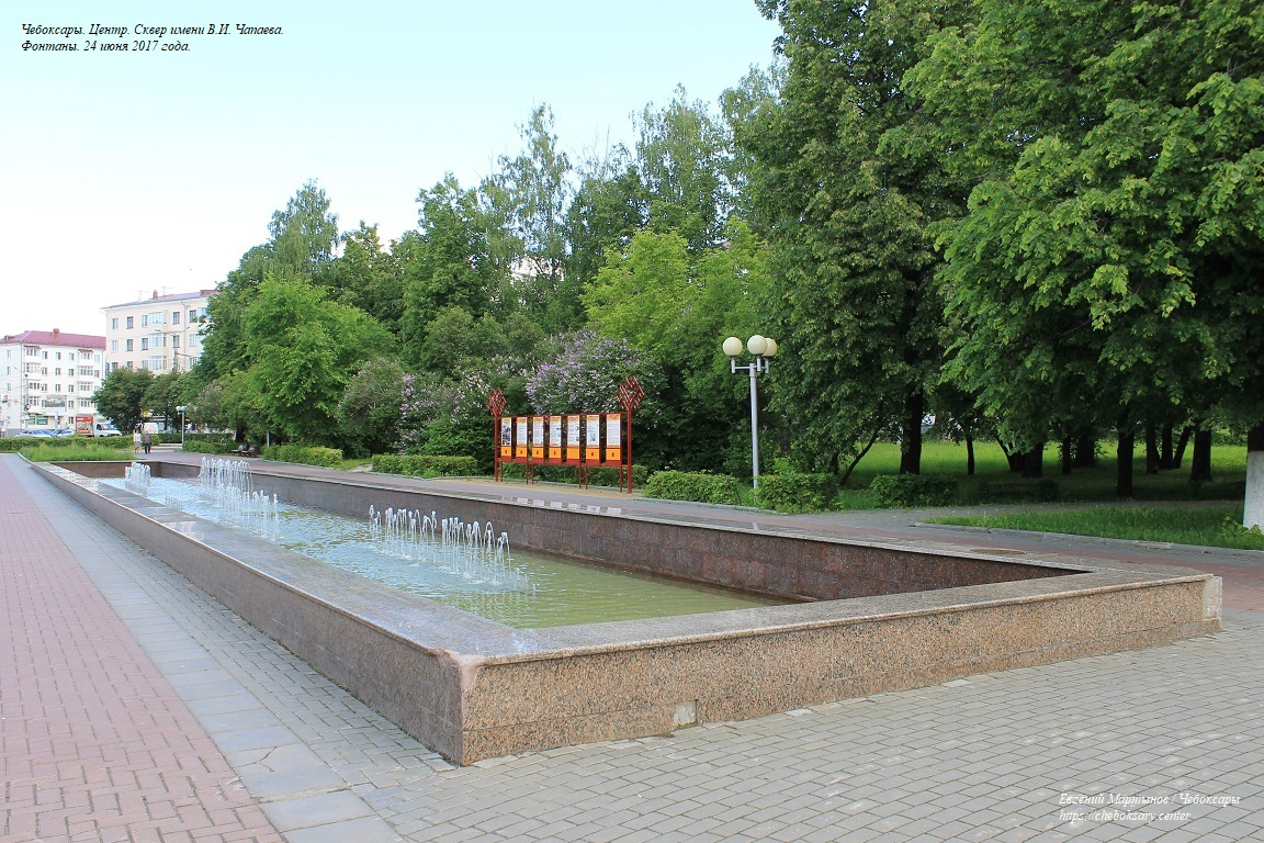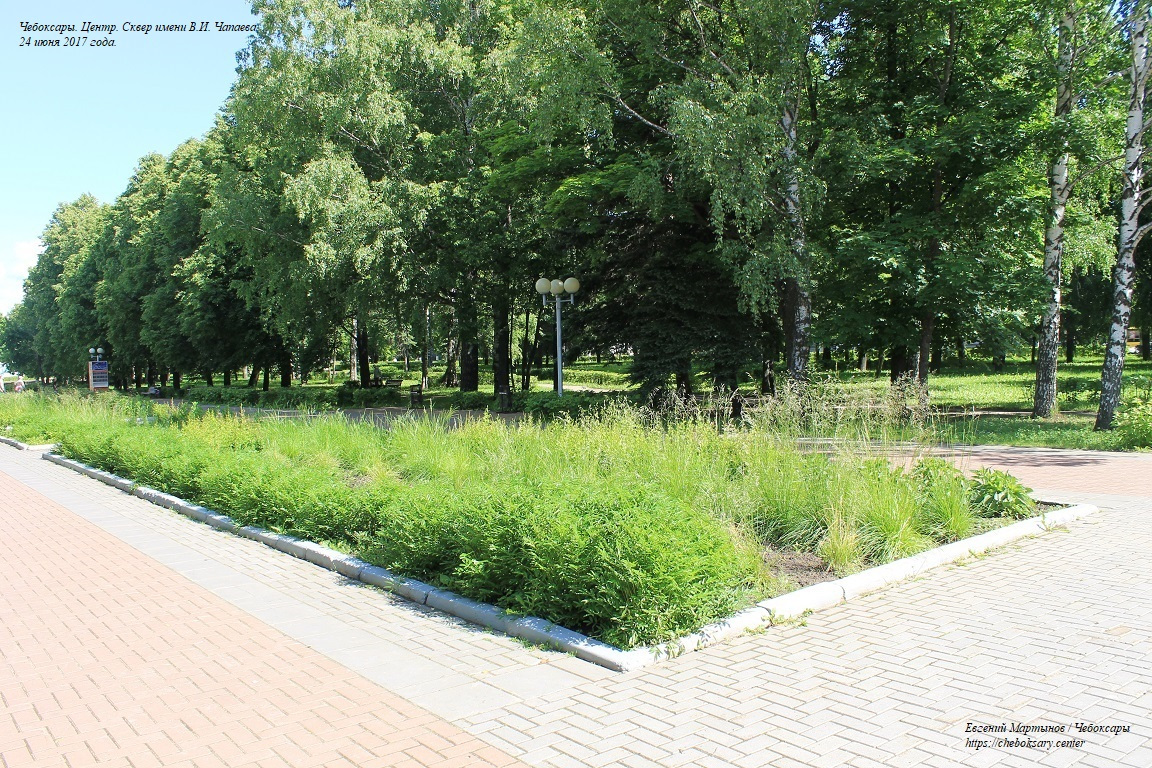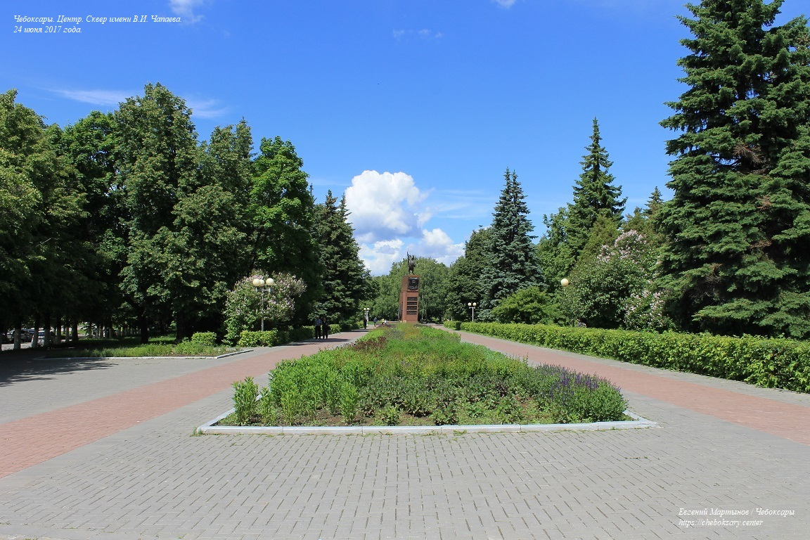Также все нижние фотографии. Сквер имени В.И. Чапаева (в городском просторечии - “Сквер Чапаева”) - пожалуй, самый известный чебоксарский сквер. Расположен в центральной части города, неподалеку от Чебоксарского железнодорожного вокзала, и идет параллельно проспекту Ленина. Сквер хорошо зарекомендовал себя как место для “спокойного” отдыха чебоксарцев - в дневное время здесь можно заметить немало прогуливающихся молодых парочек, уже состоявшихся семейных пар и людей старшего возраста; вечером скамейки “оккупируют” группы молодёжи. Все фотографии сделаны 24 июня 2017 года.