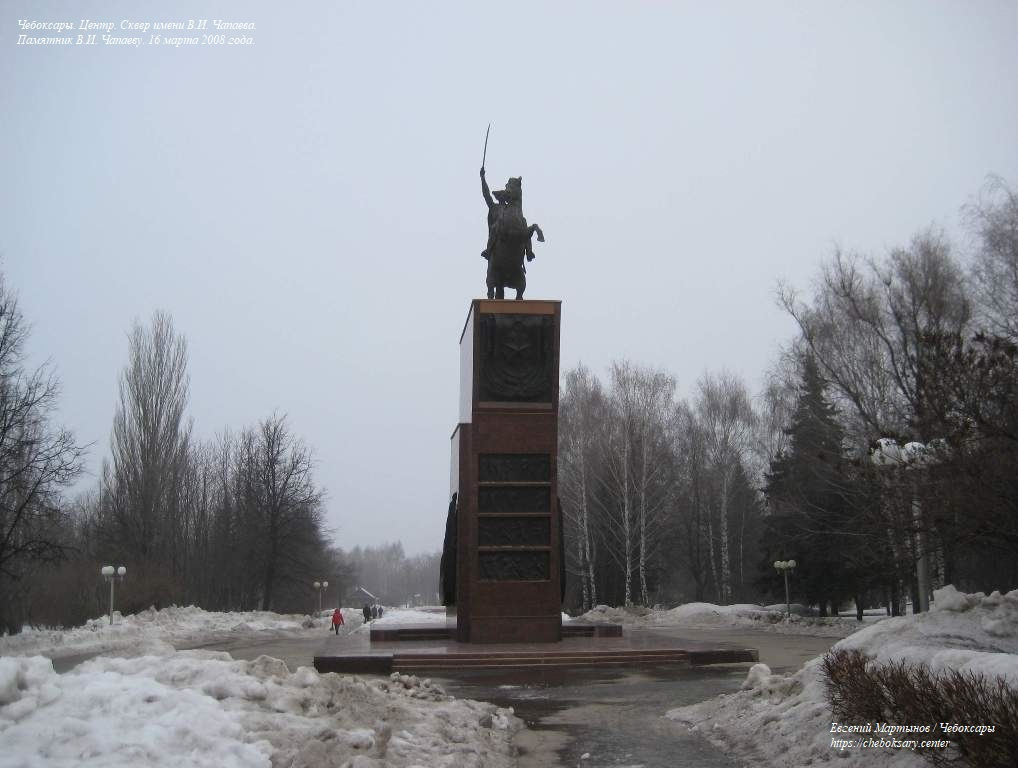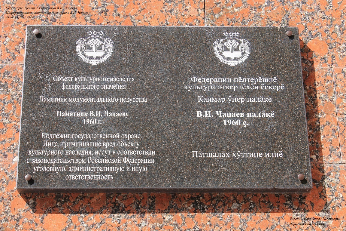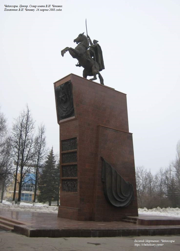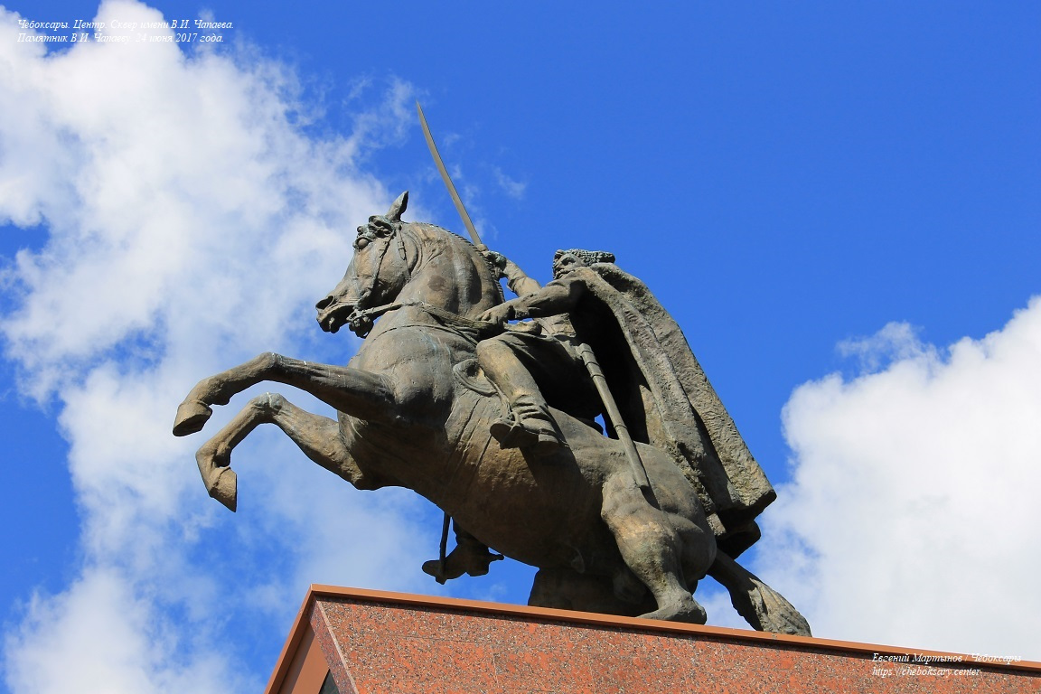 Также две нижние фотографии. Центральной экспозицией сквера является памятник Василию Ивановичу Чапаеву. Первоначально монумент украшал Приволжский павильон в ВДНХ (г. Москва), затем перемещён в Чебоксары. Памятник был открыт в июне 1960 года, и является объектом культурного наследия федерального значения. На верхнем фотоснимке - общий вид на памятник. На среднем фотоснимке - информационная надпись на постаменте. Информация на табличке продублирована и на чувашском языке. На третьем фотоснимке - скульптура Василия Ивановича Чапаева на коне и с саблей крупным планом.