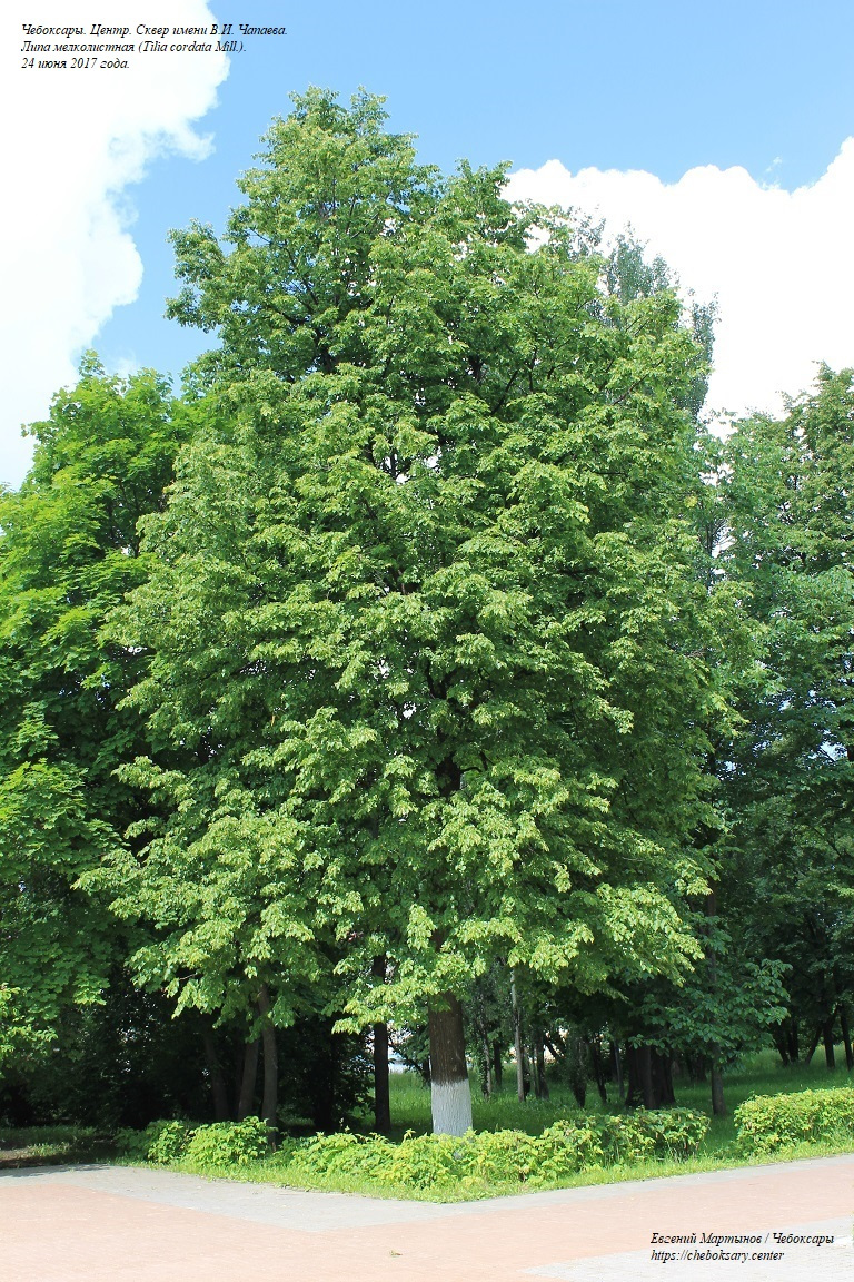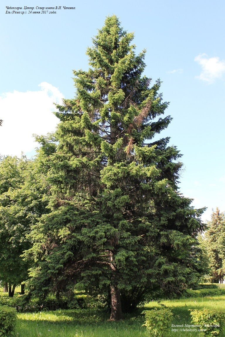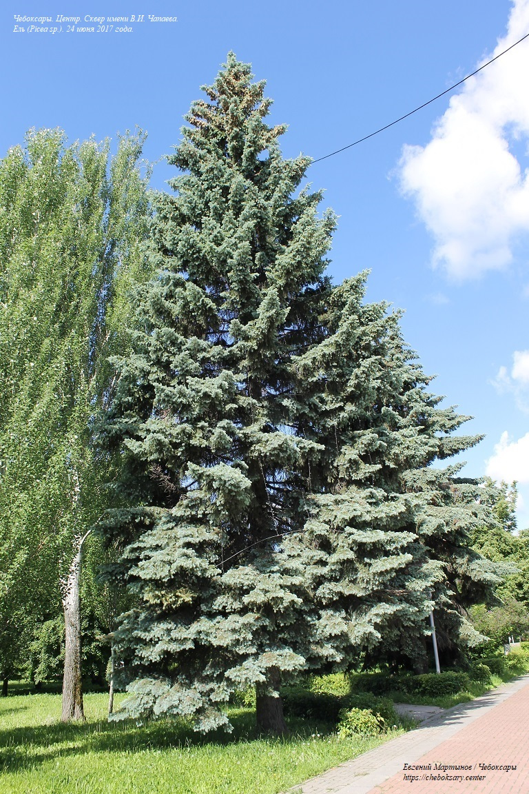 Также две нижние фотографии. На территории сквера произрастают различные древесные породы - как лиственные, так и хвойные. К примеру, возле одного из входов в сквер (со стороны Чебоксарского железнодорожного вокзала), представлена красивая и высокая ель (Picea sp.; на верхнем фотоснимке). На среднем фотоснимке - ещё одна ель. Вечнозелёные деревья этой породы есть и на других участках сквера Чапаева (к примеру, ещё несколько зрелых деревьев произрастают на главной аллее сквера в районе памятника комдиву). Однако, преобладающей древесной породой в сквере является липа мелколистная (Tilia cordata Mill.; нижний фотоснимок). Липы встречаются на всей территории зелёной зоны.