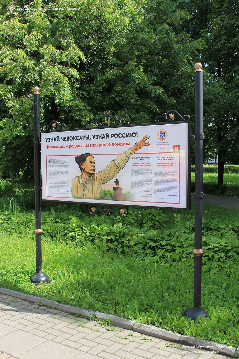 Информационный стенд, кратко повествующий о личности В.И. Чапаева (текст продублирован на трёх языках - русском, чувашском и английском).