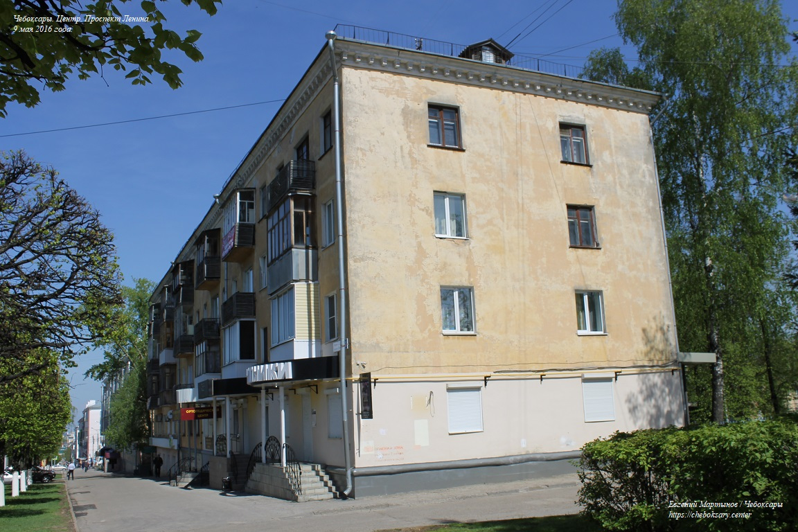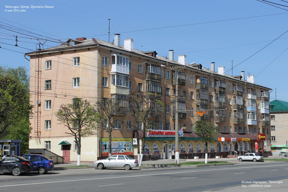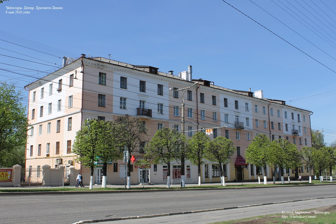 Также пять нижних фотографий. Жилые дома по проспекту Ленина (впрочем, как и на многих других улицах центральной части Чебоксар), представлены преимущественно 4-х и 5-этажными кирпичными строениями хрущёвской постройки (т.н. “хрущёвками”), возведёнными еще в советское время (50-60-ые гг. прошлого столетия).