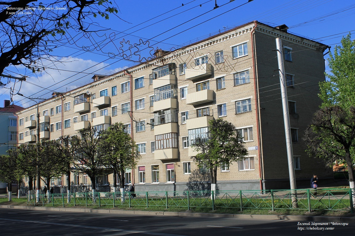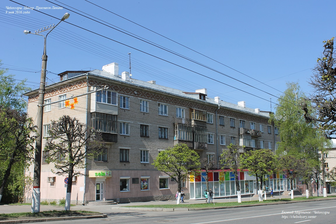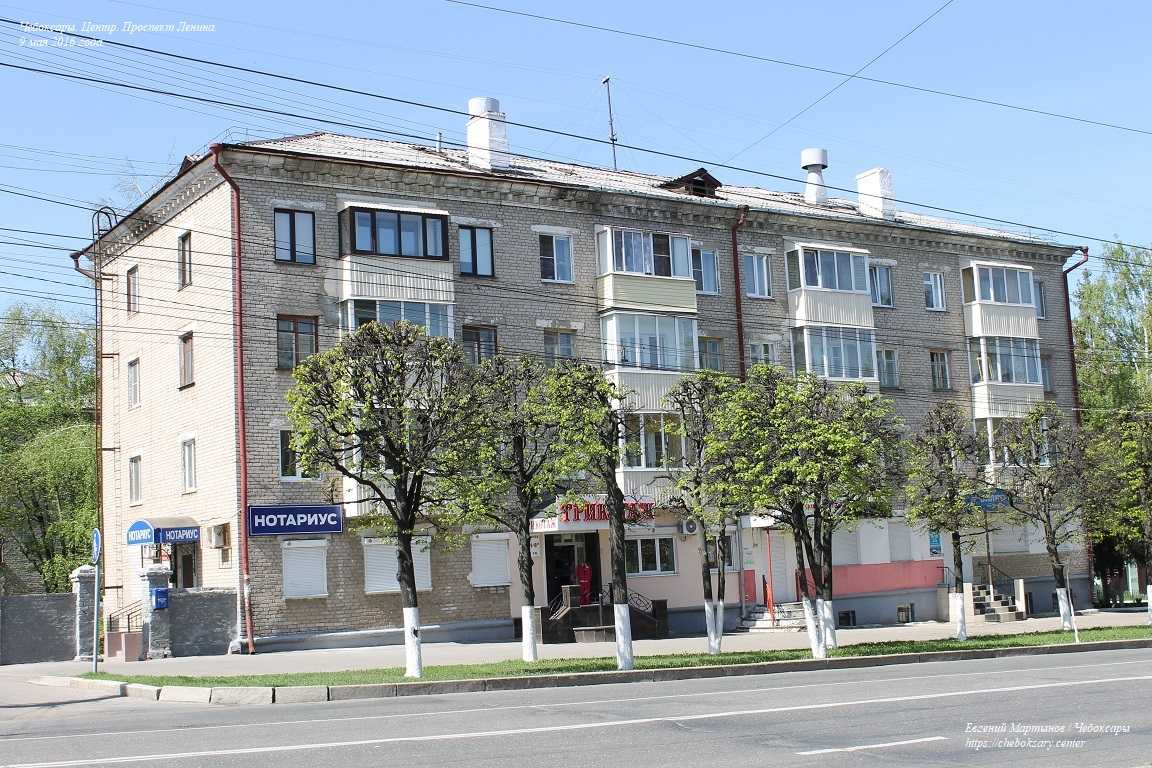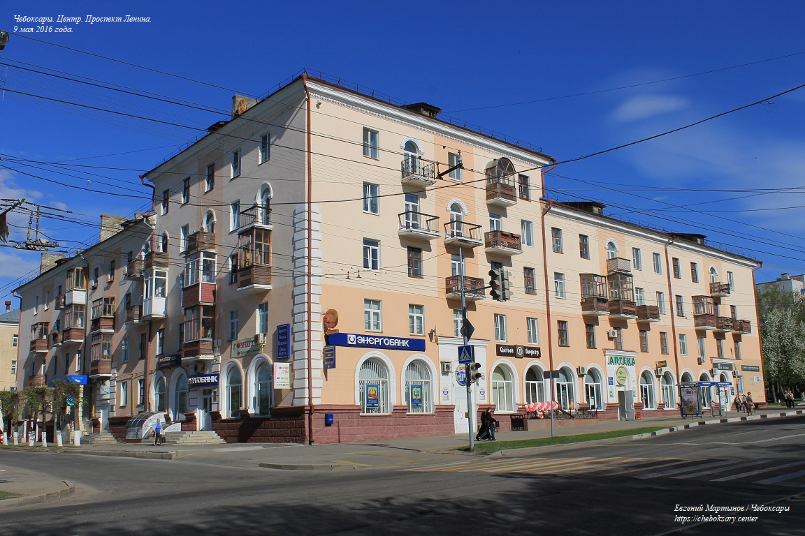 Также пять нижних фотографий. Жилые дома по проспекту Ленина (впрочем, как и на многих других улицах центральной части Чебоксар), представлены преимущественно 4-х и 5-этажными кирпичными строениями хрущёвской постройки (т.н. “хрущёвками”), возведёнными еще в советское время (50-60-ые гг. прошлого столетия).