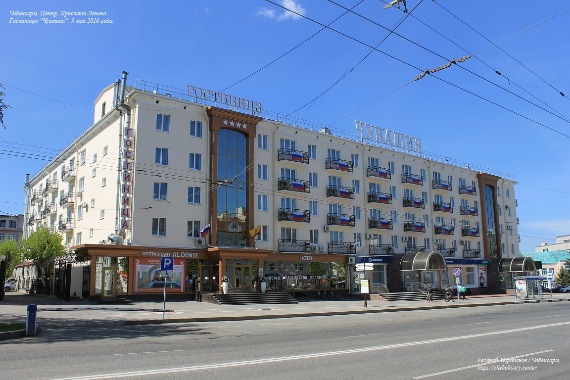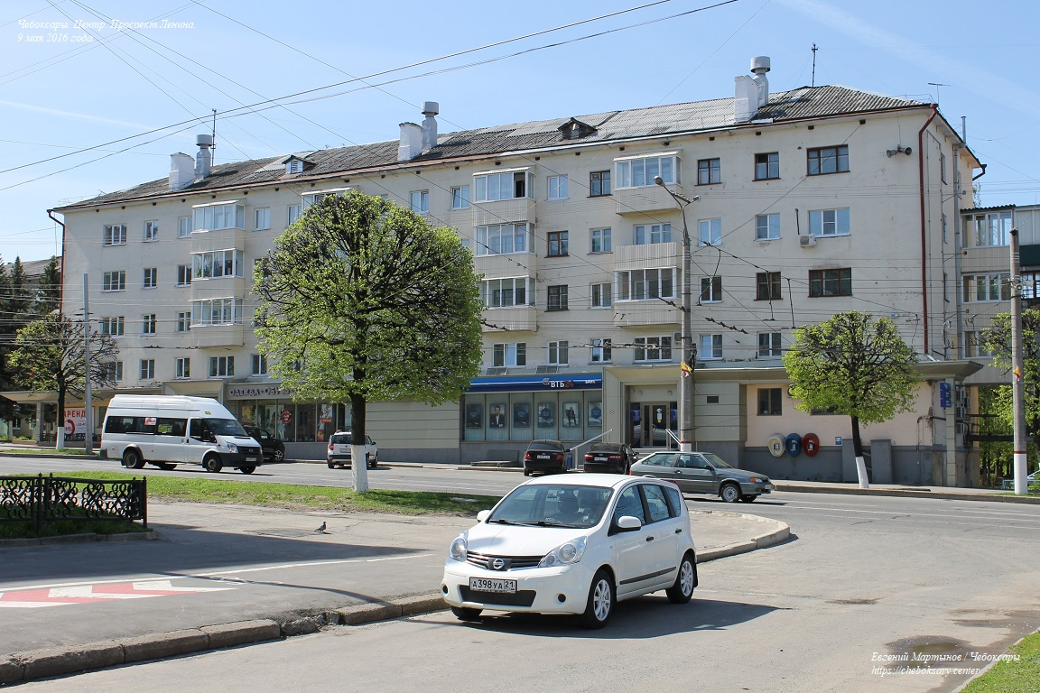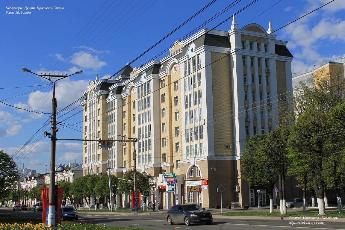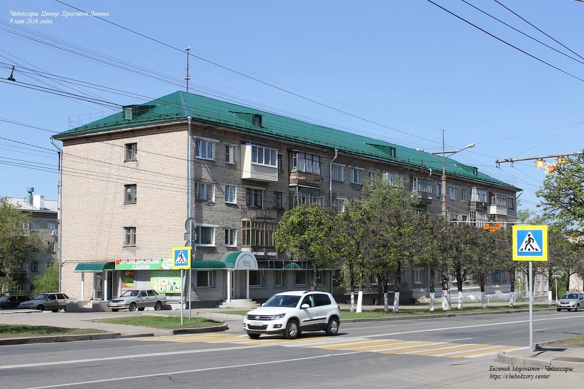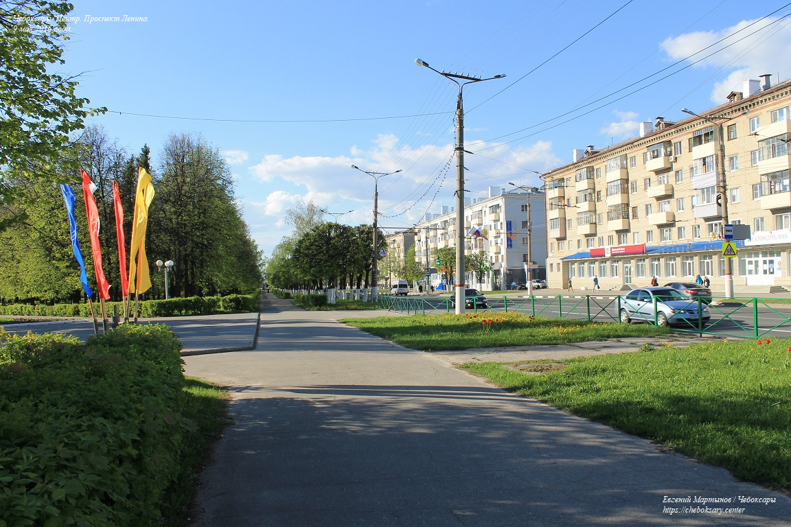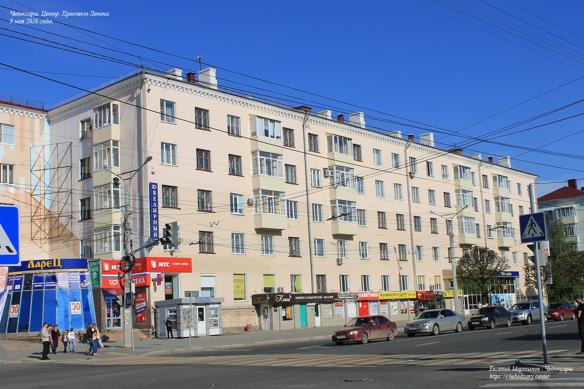 Также все нижние фотографии. Проспект Ленина (чуваш. Ленин проспекчӗ) - одна из основных улиц центральной части города. Выводит транспортные потоки из Новоюжного района и Южного посёлка в центр, и далее (через улицу Карла Маркса) - в район Чебоксарского залива и Северо-Запад города. Проспект имеет по две полосы движения в обоих направлениях, что позволяет относительно беспрепятственно перемещаться транспорту между указанными районами Чебоксар. На всём своём протяжении проспект Ленина оборудован многочисленными регулируемыми и нерегулируемыми пешеходными переходами (всего более десятка). Общая протяженность проспекта Ленина составляет более 2 километров. Все фотографии сделаны 9 мая 2016 года.