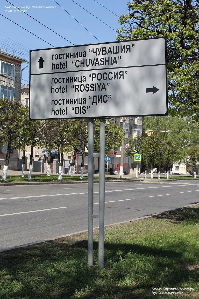 Указатель направления движения в сторону чебоксарских гостиниц (для удобства иностранных посетителей города продублирован на английском языке).