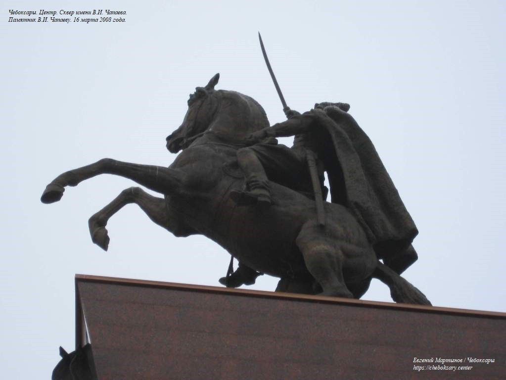 Также две нижние фотографии. Центральной экспозицией сквера является памятник Василию Ивановичу Чапаеву. Первоначально монумент украшал Приволжский павильон в ВДНХ (г. Москва), затем перемещён в Чебоксары. Памятник был открыт в июне 1960 году, и является объектом культурного наследия федерального значения. На верхнем фотоснимке - общий вид на памятник. На среднем фотоснимке - информационная надпись на постаменте. Информация на табличке продублирована и на чувашском языке. На третьем фотоснимке - скульптура Василия Ивановича Чапаева на коне и с саблей крупным планом.
