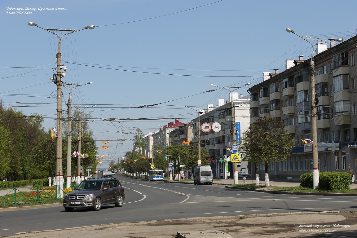 Также все нижние фотографии. Проспект Ленина (чуваш. Ленин проспекчӗ) - одна из основных улиц центральной части города. Выводит транспортные потоки из Новоюжного района и Южного посёлка в центр, и далее (через улицу Карла Маркса) - в район Чебоксарского залива и Северо-Запад города. Проспект имеет по две полосы движения в обоих направлениях, что позволяет относительно беспрепятственно перемещаться транспорту между указанными районами Чебоксар. На всём своём протяжении проспект Ленина оборудован многочисленными регулируемыми и нерегулируемыми пешеходными переходами (всего более десятка). Общая протяженность проспекта Ленина составляет более 2 километров. Все фотографии сделаны 9 мая 2016 года.